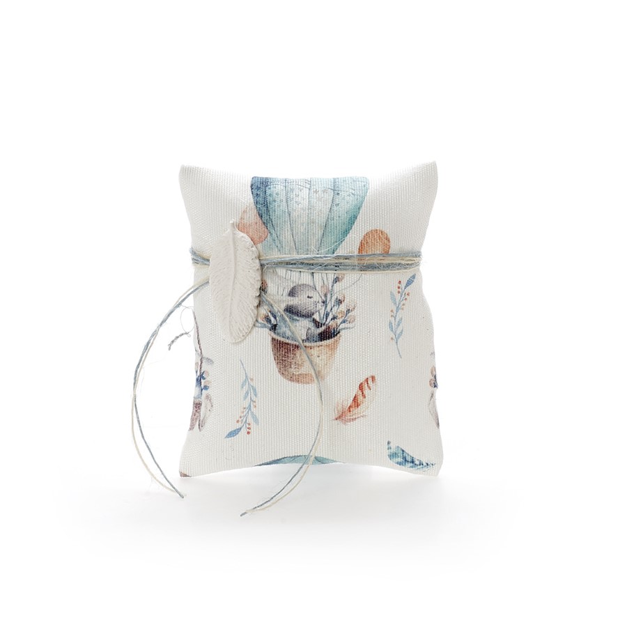 Βάλτε μεράκι και φαντασία φτιάχνοντας μία βάπτιση που θα αφήσει εποχή,διαλέγοντας μέσα από τα νέα σχέδιά μας τη μπομπονιέρα της αρεσκείας σας. Σας προτείνουμε τη μπομπονιέρα σε σχήμα  μαξιλαράκι με αφρώδες υφή ,η οποία θα αποτελέσει ένα όμορφο ενθύμιο για τους καλεσμένους σας ,αντέχοντας στο πέρασμα του χρόνου.Το σχέδιο με το λαγουδάκι στο αερόστατο θα σας ταξιδέψει και θα αποτελέσει μία ωραία πινελιά.Έχει διακοσμητικό κορδονάκι και ακρυλικό φτερό, αρωματισμένο με λεβάντα.Εμπνευστείτε μέσα από την μεγάλη ποικιλία των προιόντων μας για να ολοκληρώσετε το στολισμό.Περιέχει 5 κουφέτα αμυγδάλου Χατζηγιαννάκης ή smarties και η διάσταση είναι 9.5Χ9.5 εκ.. Κάθε μπομπονιέρα κατασκευάζεται με ελεγμένα υλικά υψηλής ποιότητας, υπό την επίβλεψη και προσωπική μας φροντίδα, αποκλειστικά και μόνο στο χώρο μας, ώστε να μπορούμε να ελέγξουμε σε κάθε στάδιο κατασκευής της μπομπονιέρας ότι το αποτέλεσμα θα είναι ακριβώς αυτό που έχετε επιλέξει για τις σημαντικότερες στιγμές της ζωής σας.Στην τιμή συμπεριλαμβάνεται ο Φ.Π.Α.,και η ελάχιστη παραγγελία είναι 30 τεμ..