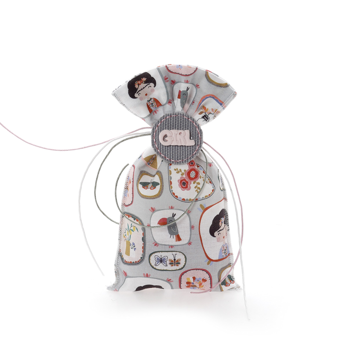Επιλέξτε μία όμορφη μπομπονιέρα πουγκάκι από βαμβακερό ύφασμα σε ωραία απόχρωση με σχέδια λουλούδια,πεταλούδες και τη φιγούρα της διάσημης ζωγράφου Frida Kahlo για να δώσετε μία ξεχωριστή πινελιά την ημέρα της βάπτισης.Μπορεί επίσης να αποτυπωθεί το φύλο από το αγγελούδι σας,σε ένα λαμιναρισμένο ύφασμα.Δένεται με κορδελάκια σε ίδιους χρωματικούς τόνους και είναι έτοιμη  να εντυπωσιάσει τους καλεσμένους.Εσωτερικά περιέχει 5 κουφέτα αμυγδάλου Χατζηγιαννάκης ή smarties και η διάσταση είναι 14Χ8 εκ.. Κάθε μπομπονιέρα κατασκευάζεται με ελεγμένα υλικά υψηλής ποιότητας, υπό την επίβλεψη και προσωπική μας φροντίδα, αποκλειστικά και μόνο στο χώρο μας, ώστε να μπορούμε να ελέγξουμε σε κάθε στάδιο κατασκευής της μπομπονιέρας ότι το αποτέλεσμα θα είναι ακριβώς αυτό που έχετε επιλέξει για τις σημαντικότερες στιγμές της ζωής σας.Στην τιμή συμπεριλαμβάνεται ο Φ.Π.Α.,και η ελάχιστη παραγγελία είναι 30 τεμ..