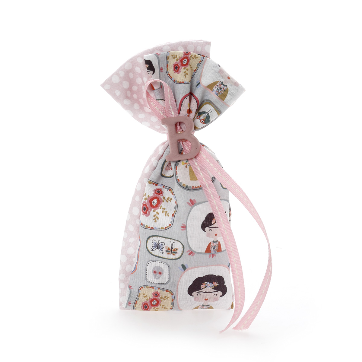 Επιλέξτε μία όμορφη μπομπονιέρα πουγκάκι από βαμβακερά υφάσματα mix and match σε αποχρώσεις του ροζ πουά και με φιγούρες λουλουδιών και της Frida Kahlo. Δένεται με κορδελάκια σε ίδιους χρωματικούς τόνους και διαθέτει ακρυλικό διακοσμητικό με το μονόγραμμα του παιδιού,με άρωμα λεβάντας.Να είστε σίγουροι πως θα εντυπωσιάσει τους καλεσμένους.Εσωτερικά περιέχει 5 κουφέτα αμυγδάλου Χατζηγιαννάκης ή smarties και η διάσταση είναι 16Χ8 εκ.. Κάθε μπομπονιέρα κατασκευάζεται με ελεγμένα υλικά υψηλής ποιότητας, υπό την επίβλεψη και προσωπική μας φροντίδα, αποκλειστικά και μόνο στο χώρο μας, ώστε να μπορούμε να ελέγξουμε σε κάθε στάδιο κατασκευής της μπομπονιέρας ότι το αποτέλεσμα θα είναι ακριβώς αυτό που έχετε επιλέξει για τις σημαντικότερες στιγμές της ζωής σας.Στην τιμή συμπεριλαμβάνεται ο Φ.Π.Α.,και η ελάχιστη παραγγελία είναι 30 τεμ..