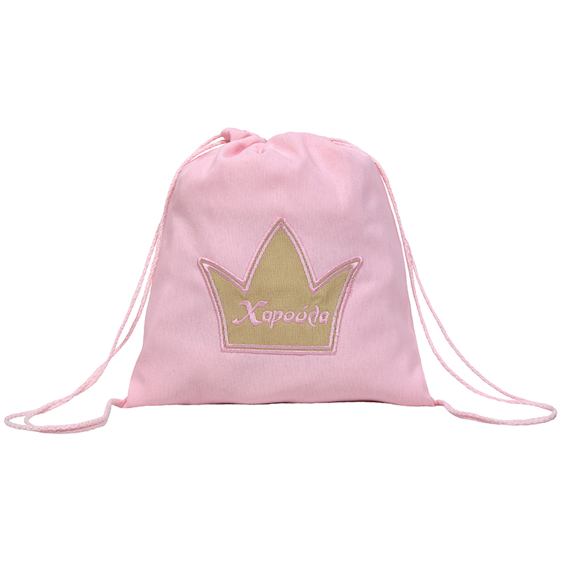 Παιδικό Backpack σε ροζ απόχρωση και χρυσή κορώνα από πικέ ύφασμα, με ροζ κορδόνια και κεντημένο το όνομα της Χαρούλας είναι μια πρόταση από εμάς. Εσείς μπορείτε να αλλάξετε επιμέρους ένα ή και όλα τα χρώματα, το όνομα και να δημιουργήσετε ένα πραγματικά μοναδικό δώρο. Ένα παιδικό backpack σε σχήμα πουγκιού, από ανθεκτικό ύφασμα ιδανικό για την βάπτιση, το party και τις καθημερινές δραστηριότητες. Αποτελεί μια άνετη και ασφαλής επιλογή για τα πράγματά της αφού σουρώνει στο πάνω μέρος. Η διάσταση της είναι 30Χ25 εκ..