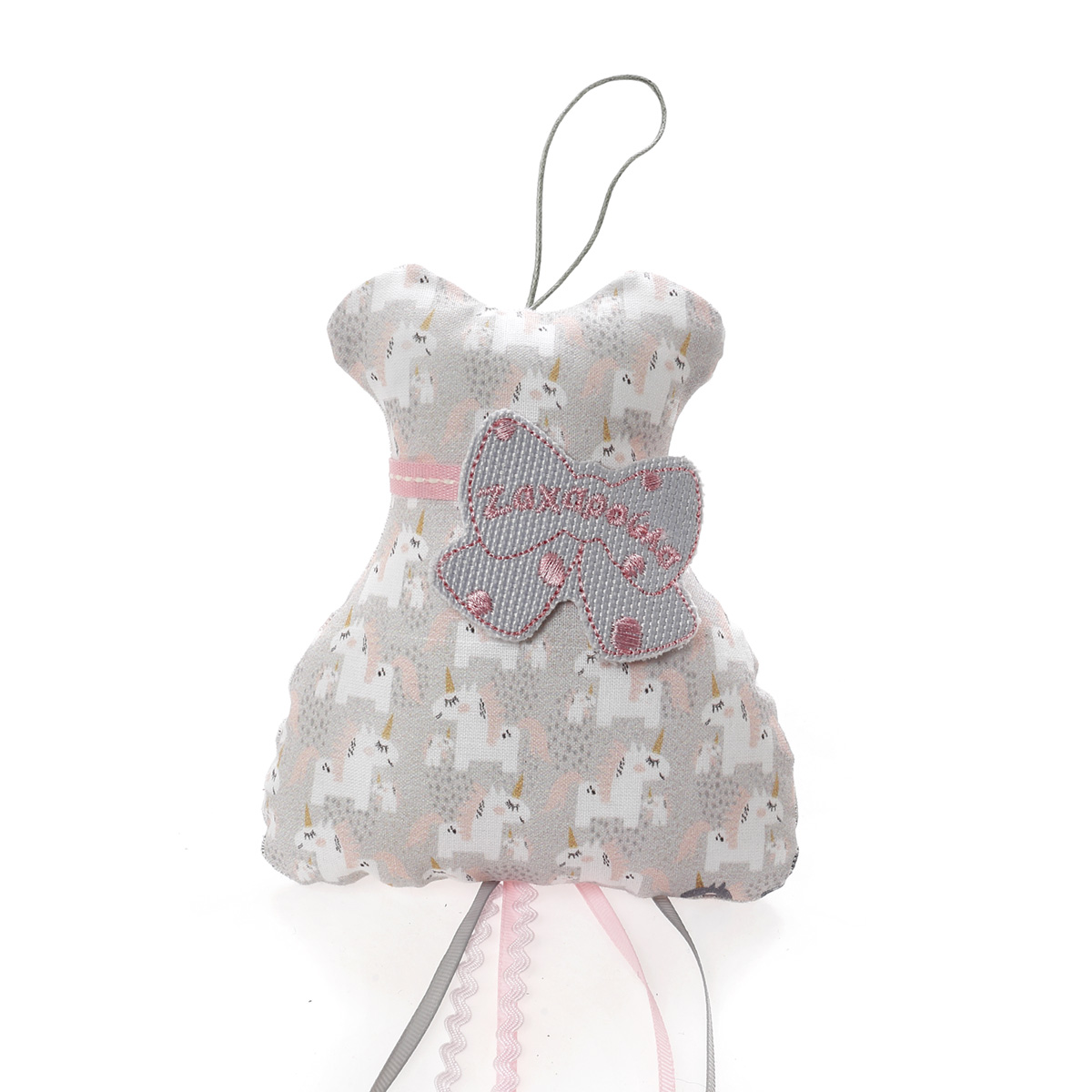 Μία πρωτότυπη μπομπονιέρα για μία εντυπωσιακή πινελιά στη βάπτιση του παιδιού σας. Διαλέξτε το σχέδιο του φορέματος από βαμβακερό ύφασμα με φιγούρες μονόκερου και αφρώδες υφή. Δένεται με χρωματιστές κορδελίτσες και διαθέτει λαμιναρισμένο διακοσμητικό φιογκάκι με αποτυπωμένο το όνομα του παιδιού. Περιέχει 5 κουφέτα αμυγδάλου Χατζηγιαννάκης ή smarties και η διάσταση είναι 13Χ11 εκ.. Κάθε μπομπονιέρα κατασκευάζεται με ελεγμένα υλικά υψηλής ποιότητας, υπό την επίβλεψη και προσωπική μας φροντίδα, αποκλειστικά και μόνο στο χώρο μας, ώστε να μπορούμε να ελέγξουμε σε κάθε στάδιο κατασκευής της μπομπονιέρας ότι το αποτέλεσμα θα είναι ακριβώς αυτό που έχετε επιλέξει για τις σημαντικότερες στιγμές της ζωής σας. Στην τιμή συμπεριλαμβάνεται ο Φ.Π.Α., και η ελάχιστη παραγγελία είναι 30 τεμ..