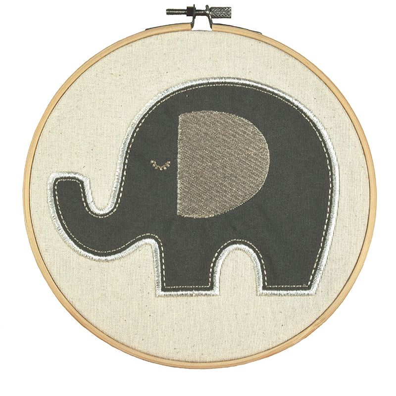Διακοσμήστε το παιδικό δωμάτιο με ένα χαριτωμένο κεντημένο ελέφαντα, σε ένα διακοσμητικό καδράκι με τη διαδικασία applique. Μπορεί να γίνει και ένα υπέροχο δωράκι σε Baby Shower, μαιευτήριο, βάπτιση, γενέθλια. Κεντήστε το όνομα του παιδιού για να γίνει ακόμα πιο ξεχωριστό. Η διάσταση του τελάρου είναι 17 εκ διάμετρο.