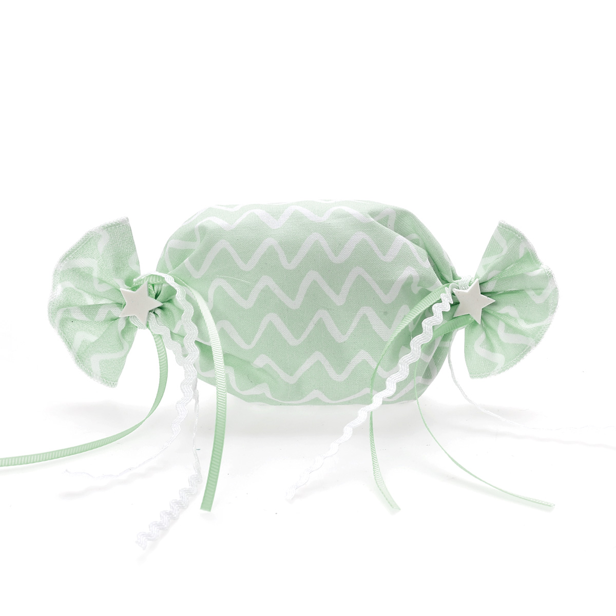 Χειροποίητη μπομπονιέρα βάπτισης σε σχήμα καραμέλας από βαμβακερό ύφασμα στο χρώμα της μέντας. Είναι δεμένη με κορδελίτσες και διακοσμητικά ακρυλικά αστεράκια ,με άρωμα λεβάντας. Εσωτερικά περιέχει 5 κουφέτα αμυγδάλου Χατζηγιαννάκης ή smarties και η διάσταση είναι 14Χ7.5 εκ.. Κάθε μπομπονιέρα κατασκευάζεται με ελεγμένα υλικά υψηλής ποιότητας, υπό την επίβλεψη και προσωπική μας φροντίδα, αποκλειστικά και μόνο στο χώρο μας, ώστε να μπορούμε να ελέγξουμε σε κάθε στάδιο κατασκευής της μπομπονιέρας ότι το αποτέλεσμα θα είναι ακριβώς αυτό που έχετε επιλέξει για τις σημαντικότερες στιγμές της ζωής σας. Στην τιμή συμπεριλαμβάνεται ο Φ.Π.Α., και η ελάχιστη παραγγελία είναι 30 τεμ..