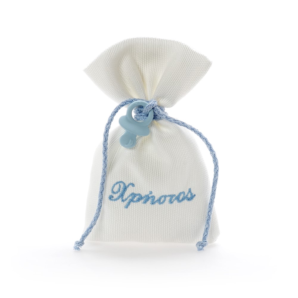 Επιλέξτε μία όμορφη μπομπονιέρα πουγκί από λευκό πικέ ύφασμα που θα εντυπωσιάσει και θα κλέψει την παράσταση στην πιο σημαντική ημέρα των μικρών μας φίλων. Δένει με κορδόνι σιέλ και διαθέτει ακρυλική πιπίλα ,για να κρατά ασφαλές το περιεχόμενο. Μπορείτε να κεντήσετε το όνομα του παιδιού σας για να γίνει ακόμα πιο ξεχωριστή. Να είστε σίγουροι πως θα τραβήξει τα βλέμματα. Εσωτερικά περιέχει 5 κουφέτα αμυγδάλου Χατζηγιαννάκης ή smarties και η διάσταση είναι 17Χ11.5 εκ.. Κάθε μπομπονιέρα κατασκευάζεται με ελεγμένα υλικά υψηλής ποιότητας, υπό την επίβλεψη και προσωπική μας φροντίδα, αποκλειστικά και μόνο στο χώρο μας, ώστε να μπορούμε να ελέγξουμε σε κάθε στάδιο κατασκευής της μπομπονιέρας ότι το αποτέλεσμα θα είναι ακριβώς αυτό που έχετε επιλέξει για τις σημαντικότερες στιγμές της ζωής σας.Στην τιμή συμπεριλαμβάνεται ο Φ.Π.Α.,και η ελάχιστη παραγγελία είναι 30 τεμ..