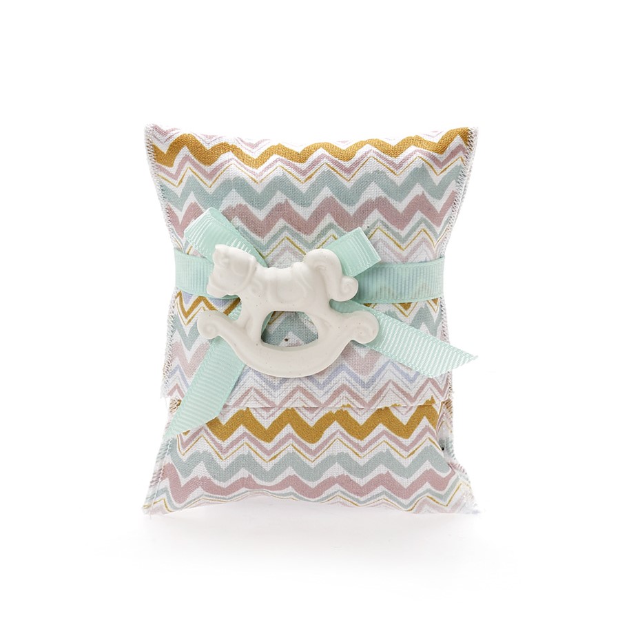 Δεν αξίζει τίποτα λιγότερο στο αγγελούδι σας από πρωτοτυπία και μοναδικές λεπτομέρειες για την ημέρα της βάπτισής του. Γι’αυτό σας προτείνουμε ένα διακοσμητικό μαξιλαράκι μπομπονιέρα με αφρώδες υφή από βαμβακερό ύφασμα με μοντέρνο χρωματισμό. Αγκαλιάζεται από κορδελίτσα σιέλ μαζί με ένα αρωματικό ακρυλικό αλογάκι. Εμπνευστείτε μέσα από την μεγάλη ποικιλία των προιόντων μας για να ολοκληρώσετε το στολισμό. Περιέχει 5 κουφέτα αμυγδάλου Χατζηγιαννάκης ή smarties και η διάσταση είναι 9.5Χ9.5 εκ.. Κάθε μπομπονιέρα κατασκευάζεται με ελεγμένα υλικά υψηλής ποιότητας, υπό την επίβλεψη και προσωπική μας φροντίδα, αποκλειστικά και μόνο στο χώρο μας, ώστε να μπορούμε να ελέγξουμε σε κάθε στάδιο κατασκευής της μπομπονιέρας ότι το αποτέλεσμα θα είναι ακριβώς αυτό που έχετε επιλέξει για τις σημαντικότερες στιγμές της ζωής σας.Στην τιμή συμπεριλαμβάνεται ο Φ.Π.Α.,και η ελάχιστη παραγγελία είναι 30 τεμ..