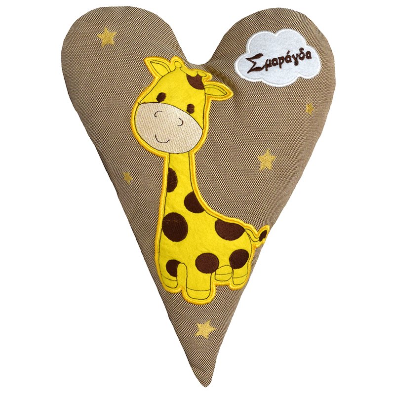 Διακοσμητικό μαξιλάρι σε σχήμα καρδιά με κεντημένη καμηλοπάρδαλη. Έχει χρώμα σε γήινους τόνους και μπορείτε να κεντήσετε το όνομά του. Δημιουργήστε όμορφους συνδυασμούς για ένα ξεχωριστό και ονειρεμένο υπνοδωμάτιο Η διάσταση του είναι 37X26εκ..