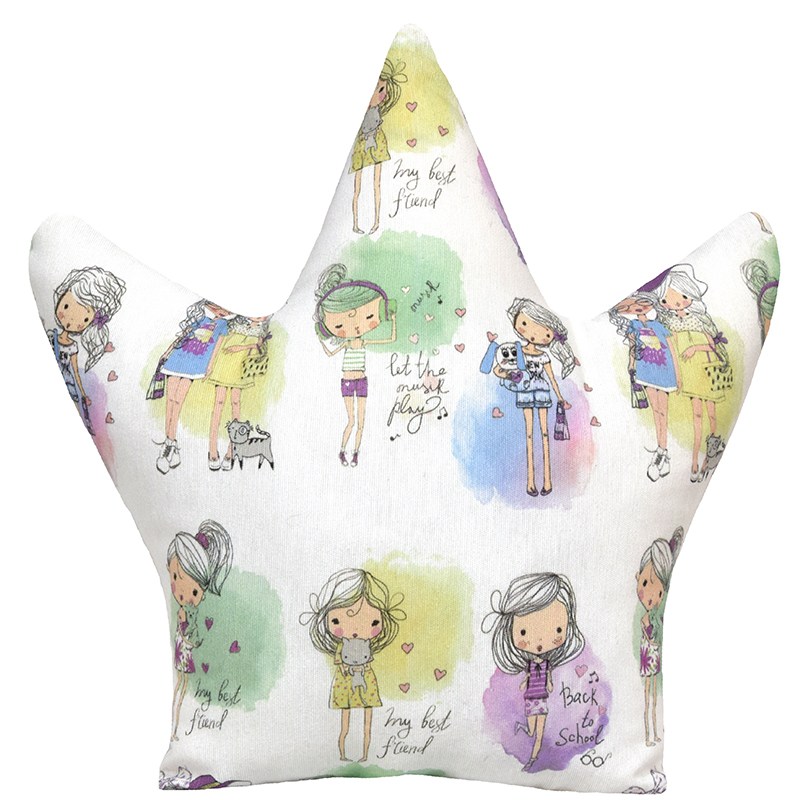 Διακοσμητικό παιδικό μαξιλάρι σε σχήμα κορώνας, ύφασμα λευκό με βεραμάν, λιλά και άλλες αποχρώσεις και θέμα τα κοριτσάκια, back to school και My best friends. Η διάσταση της κορώνας είναι 32Χ32εκ..