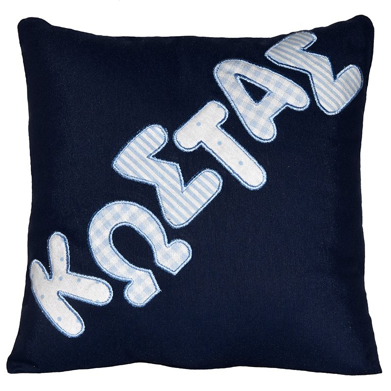 Διακοσμητικό μαξιλάρι τετράγωνο με Nave χρώμα υφάσματος, μονογράμματα σε σιέλ καρώ, πουά, ριγέ, που σχηματίζουν το όνομα Κώστας. Αυτή είναι μια πρόταση από εμάς, εσείς μπορείτε να αλλάξετε επιμέρους ένα ή και όλα τα χρώματα και να δημιουργήσετε ένα πραγματικά μοναδικό δώρο. Η διάσταση του είναι 30Χ30 εκ..
