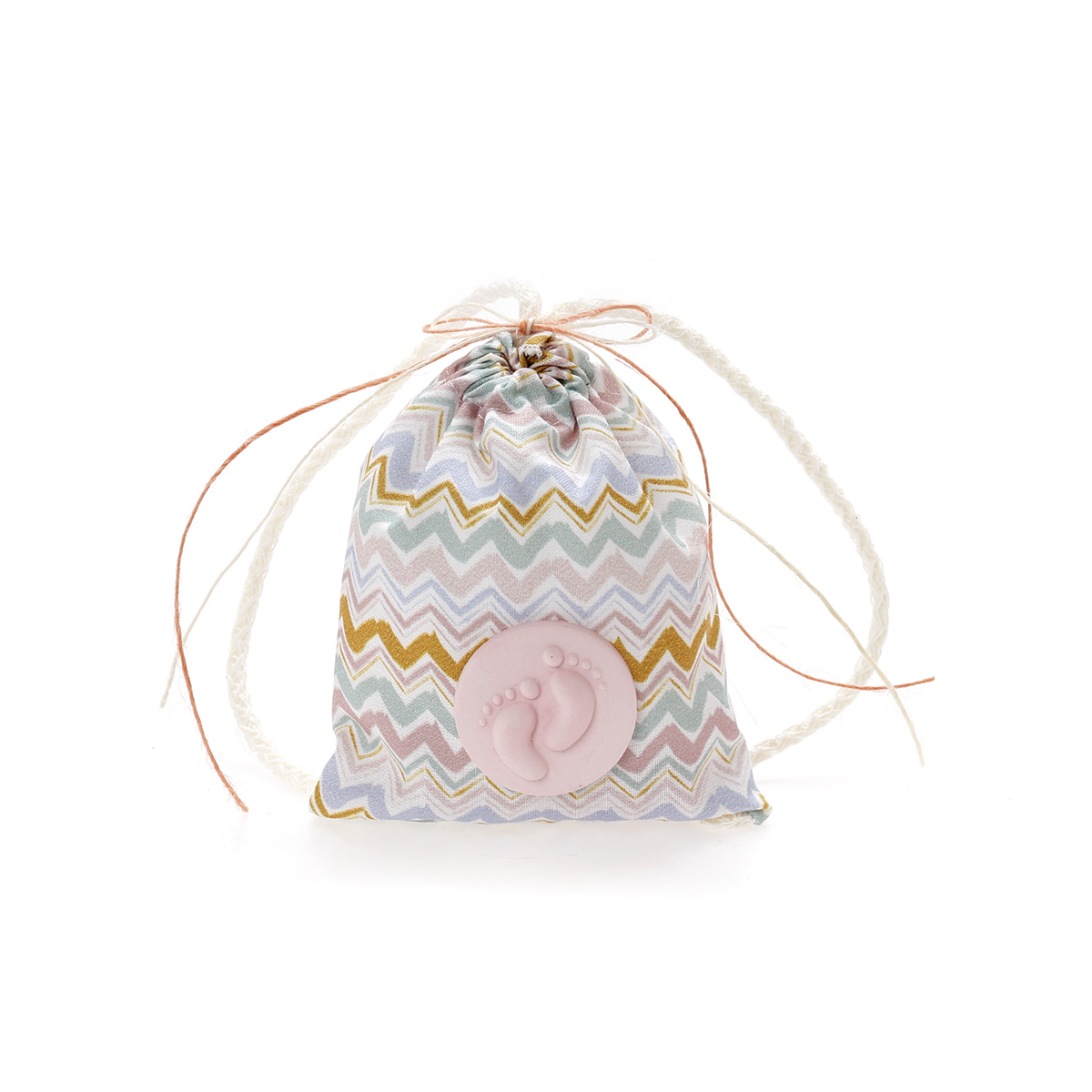 Δεν αξίζει τίποτα λιγότερο στο αγγελούδι σας από πρωτοτυπία και μοναδικές λεπτομέρειες για την ημέρα της βάπτισής του. Γι’αυτό σας προτείνουμε τη μπομπονιέρα πουγκάκι από βαμβακερό ύφασμα με ρομαντική διάθεση και μοντέρνα χρώματα.Σουρώνει με κορδονάκια για να κρατά ασφαλές το περιεχόμενο και διαθέτει ακρυλικό διακοσμητικό μωρουδίστικα πατουσάκια,με άρωμα λεβάντας.Εμπνευστείτε μέσα από την μεγάλη ποικιλία των προιόντων μας για να ολοκληρώσετε το στολισμό.Περιέχει 5 κουφέτα αμυγδάλου Χατζηγιαννάκης ή smarties και η διάσταση είναι 10.5Χ9 εκ.. Κάθε μπομπονιέρα κατασκευάζεται με ελεγμένα υλικά υψηλής ποιότητας, υπό την επίβλεψη και προσωπική μας φροντίδα, αποκλειστικά και μόνο στο χώρο μας, ώστε να μπορούμε να ελέγξουμε σε κάθε στάδιο κατασκευής της μπομπονιέρας ότι το αποτέλεσμα θα είναι ακριβώς αυτό που έχετε επιλέξει για τις σημαντικότερες στιγμές της ζωής σας.Στην τιμή συμπεριλαμβάνεται ο Φ.Π.Α.,και η ελάχιστη παραγγελία είναι 30 τεμ..
