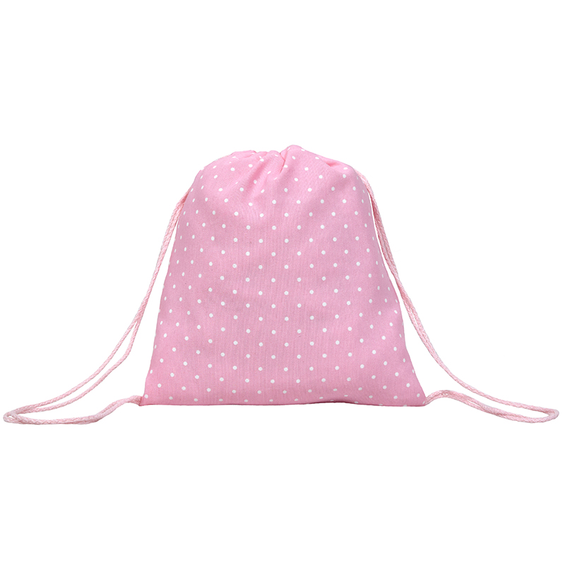 Παιδικό σακίδιο πλάτης από ύφασμα ροζ με λευκά πουά. Ένα παιδικό backpack σε σχήμα πουγκιού, από ανθεκτικό ύφασμα ιδανικό για την βάπτιση, το party και τις καθημερινές δραστηριότητες. Αποτελεί μια άνετη και ασφαλής επιλογή για τα πράγματά της αφού σουρώνει στο πάνω μέρος. Η διάσταση του είναι 30Χ25 εκ..