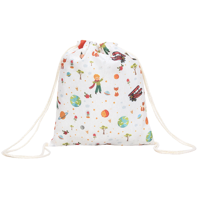 Παιδικό υφασμάτινο σακίδιο πλάτης με θέμα τον μικρό πρίγκιπας, με ύφασμα λονέτας και εκτυπωμένους πλανήτες, αεροπλάνα, λουλούδια, αλεπούδες και άλλα πολλά που θα το αγαπήσουν. Ένα παιδικό backpack σε σχήμα πουγκιού, από ανθεκτικό ύφασμα ιδανικό για την βάπτιση, το party και τις καθημερινές δραστηριότητες. Αποτελεί μια άνετη και ασφαλής επιλογή για τα πράγματά του αφού σουρώνει στο πάνω μέρος. Η διάσταση του είναι 30Χ25 εκ..