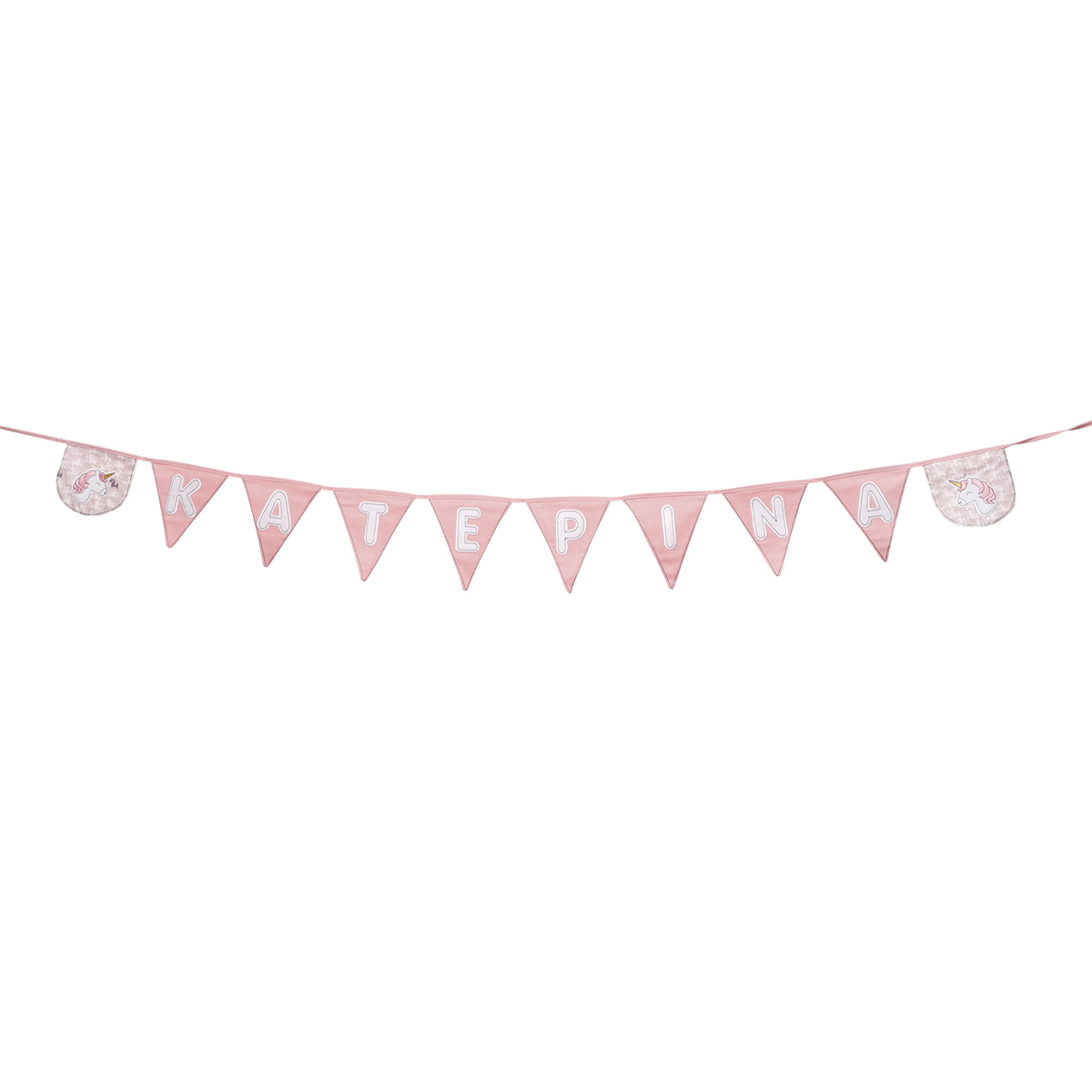 Φτιάξτε ένα ξεχωριστό στολισμό για το πάρτι ,τη βάπτιση ή για το παιδικό δωμάτιο των μικρών μας φίλων, μέσα από τα νέα μας χειροποίητα σχέδια. Επιλέξτε τα διακοσμητικά σημαιάκια με το σχέδιο του μονόκερου στα εξωτερικά σημαιάκια και το όνομα του παιδιού στα εσωτερικά. Είναι κεντημένα με τη τεχνική applique, σε υφάσματα με αποχρώσεις του ροζ. Το κόστος της γιρλάντας είναι 60€, η τιμή για το κάθε ένα γράμμα – σημαιάκι που προσθέτετε ή αφαιρείτε σε σχέση με το δείγμα είναι +- 6€. Το συνολικό της μήκος είναι 2,26 μέτρα.