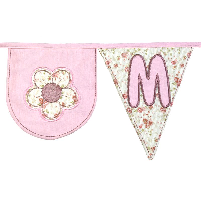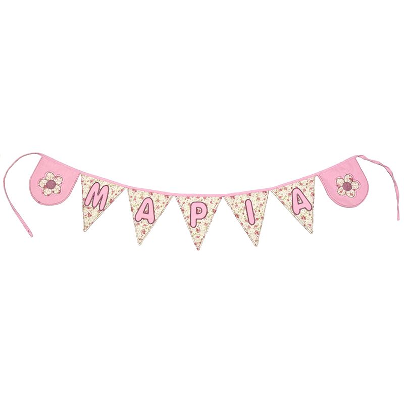 Διακοσμητικό banner από φλοράλ ύφασμα και ροζ ρέλι και μονογράμματα, με λουλούδια στις άκρες του και με μονογράμματα applique να σχηματίζουν το όνομα Μαρία. Σχηματίσετε το όνομα του παιδιού σας διαλέγοντας τo χρώμα υφάσματος στα σημαιάκια, τα γράμματα και το χρώμα του κεντήματος και σχηματίστε ένα μοναδικό τρίγωνο σημαιάκι για κάθε παιδικό δωμάτιο.