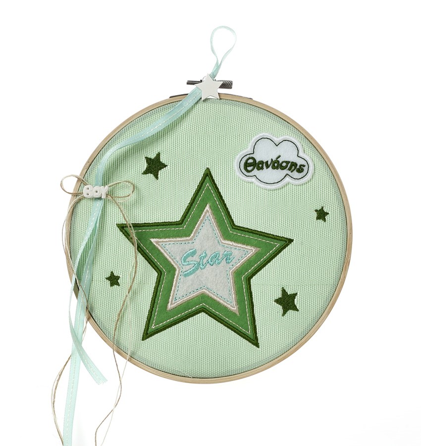 Καδράκι για παιδικό δωμάτιο με αστέρια από τσόχα και ένα συννεφάκι με το όνομα του. Με βεραμάν απόχρωση η βάση και πράσινο με εκρού αστέρι είναι μια πρόταση από εμάς, εσείς μπορείτε να αλλάξετε επιμέρους ένα ή και όλα τα χρώματα και να δημιουργήσετε ένα πραγματικά μοναδικό δώρο. Η διάσταση του τελάρου είναι 21 εκ διάμετρο.